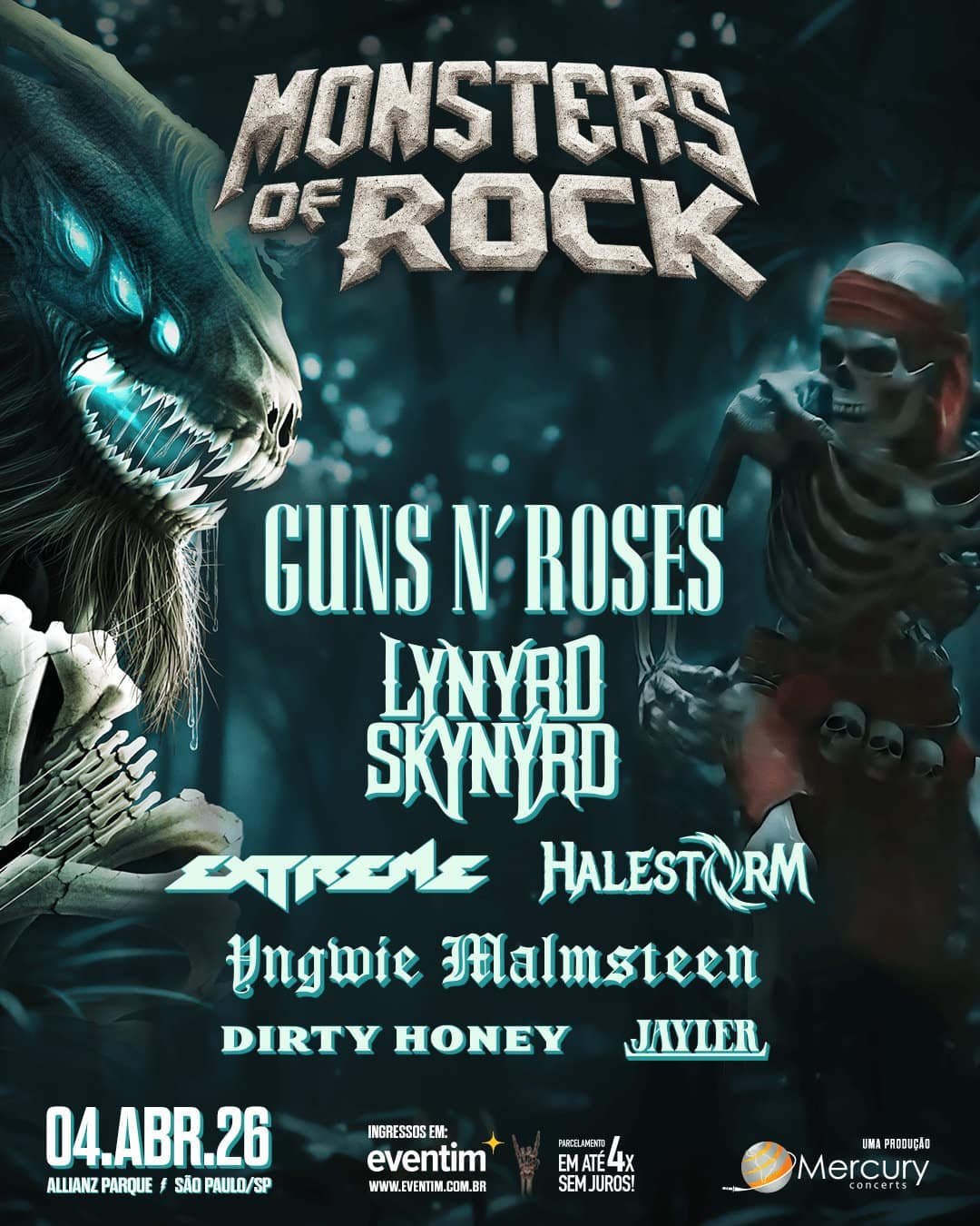 O Monsters of Rock confirma as atrações que completam o lineup de sua nona edição: Guns N’ Roses, Lynyrd Skynyrd, Extreme e Halestorm se unem a Yngwie Malmsteen, Dirty Honey e Jayler. Com eles, a edição 2026 se consolida como um dos mais grandiosos lineups da história do mais importante festival de rock do país. O evento acontece em 4 de abril de 2026, no Allianz Parque, em São Paulo, e os ingressos já estão à venda exclusivamente pelo site Eventim.